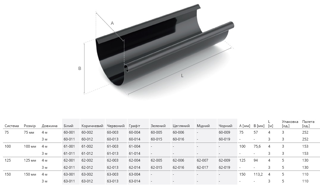 Водостічна система BRYZA представляє чотири типорозміри перерізу ринв 75, 100, 125, 150 мм.