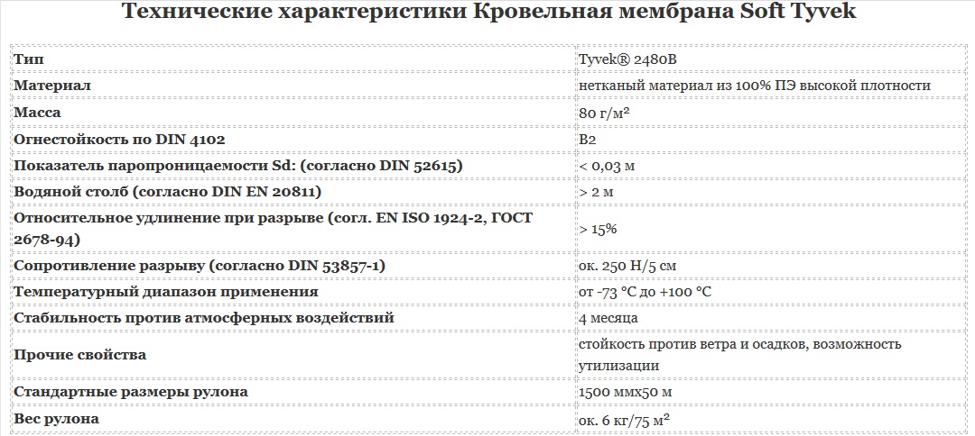 За інформацією, покрівельна мембрана Soft Tyvek – одношарова дифузійна мембрана для даху, що дихає. До речі, суперифузійна мембрана поєднує в собі характеристики декількох плівок. До того ж вона є комбінованою плівкою. Більш того, матеріал захищає конструкцію та теплоізоляцію від попадання вологи – як гідроізоляція. А також зберігають теплоенергію, запобігаючи видуванню – як вітрозахисний матеріал. До речі, матеріал дозволяє парам вологи вільно виходити назовні. Але при цьому, не дозволяючи зовнішній волозі проникнути в теплоізоляцію, забезпечуючи її ефективність. До речі, що зовсім не пропускає вітер і воду. Однак, має високі характеристики проникності пари. І взагалі, вироби Tyvek® мають унікальний функціональний шар. Завдяки якому продукт стає міцним і довговічним. Понад те, на мембрану поширюється 50-річна гарантія. А головне, плівка укладається безпосередньо на матеріал, що утеплює, без вентиляційного зазору. Склад матеріалу: HD-PE (поліетилен високої густини).