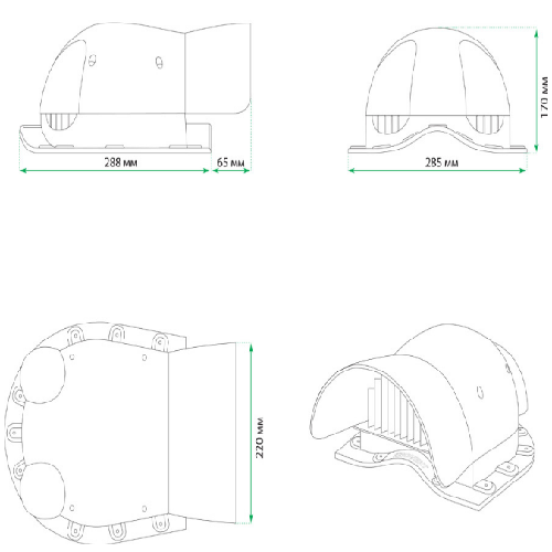 Розмір прохідного елемента 285х288мм, висота 170мм, переріз випускного каналу 45000мм. Власне, встановлюється на готову покрівлю.